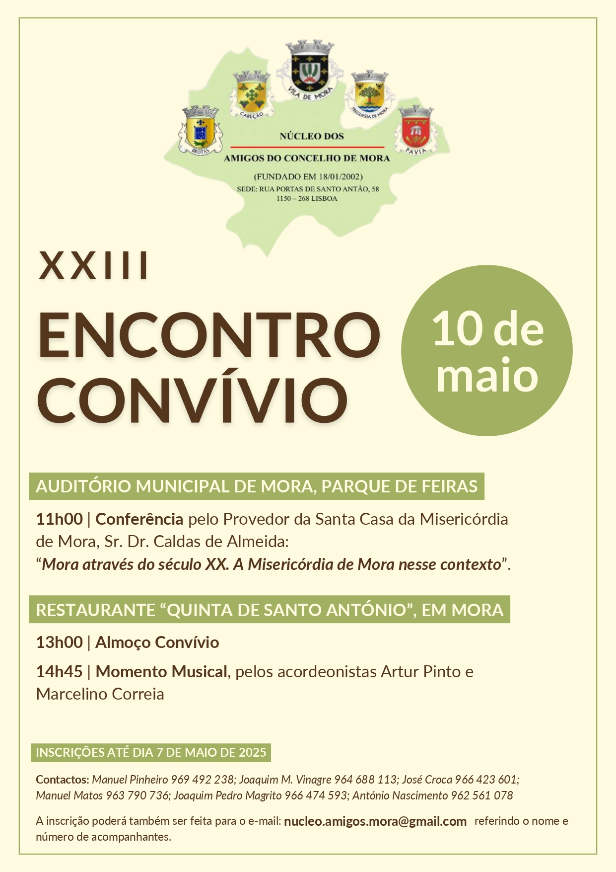 No dia 10 de maio de 2025, realizou-se na vila de Mora o XXIII Encontro do Núcleo dos Amigos do Concelho de Mora. O dia do Encontro, foi repartido por três fases distintas, a primeira com a realização da Assembleia Geral, a segunda pela Conferencia no Auditório Municipal e a terceira que culminou com o almoço convívio entre associados, convidados e participantes.